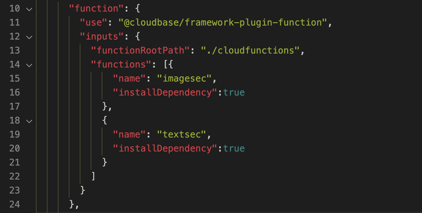 function插件主要用于部署云函数,示例项目中有两个云函数,根据业务要求进行相应配置,framework就会按照配置进行部署工作。