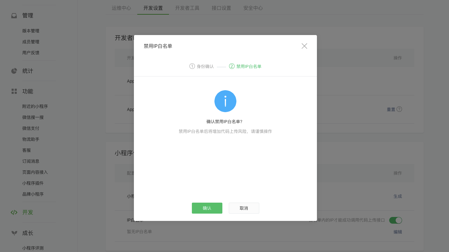 而小程序代码上传密钥,在appid的信息下方,点击生成按钮,经过微信验证下载密钥文件,将文件重新命名为private.key,放置在示例项目根目录下。另外,代码上传的IP白名单需要关闭。