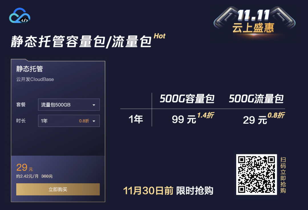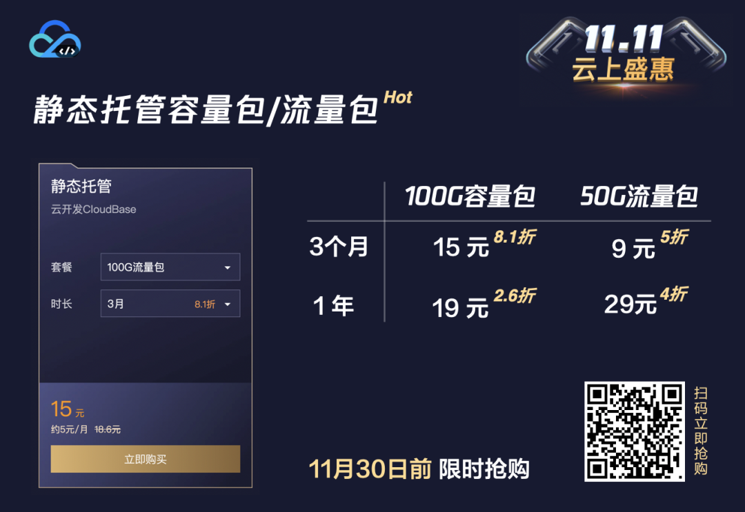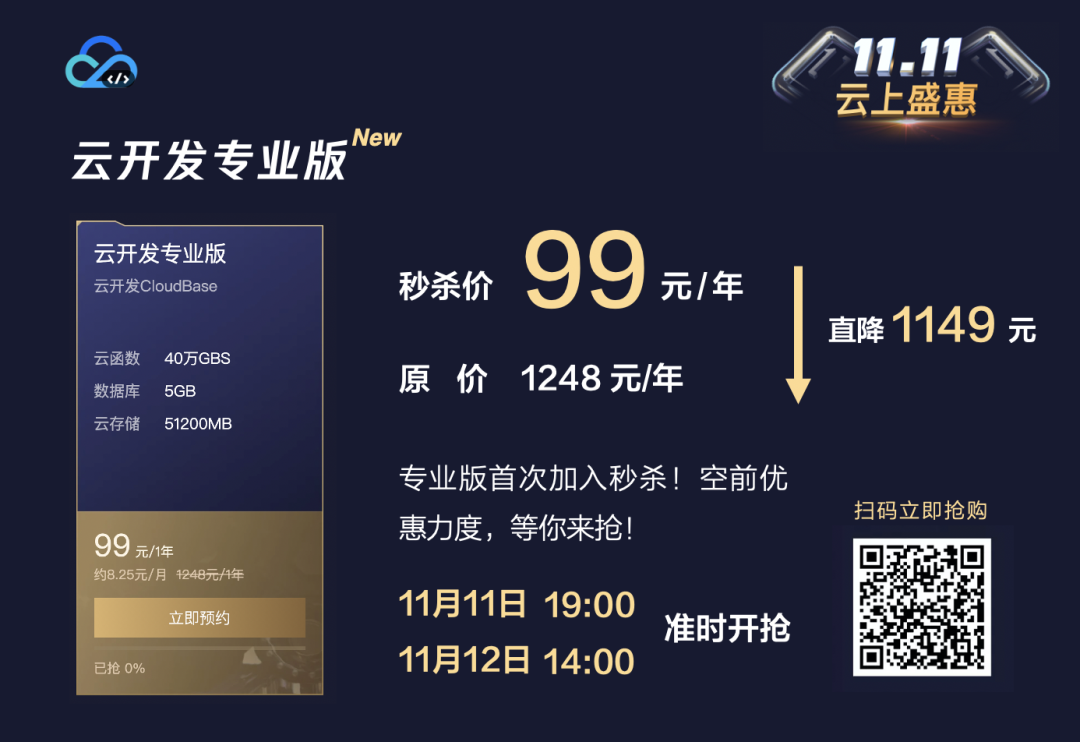 即日起至11月30日,云开发 CloudBase 感恩特惠震撼来袭,今明两天,多款爆品参与秒杀+折扣,优惠力度,历 史 最 大,部分产品低至 0.4 折/直降 1100 元,价格降至冰冰冰冰冰冰冰冰冰冰冰点,话不多说,直接上图