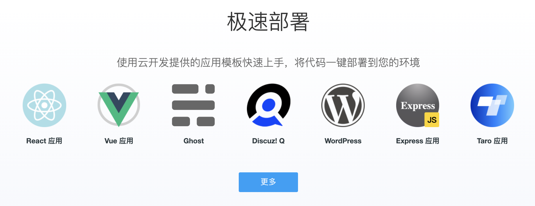 目前,借助 CloudBase Framework 的一键部署能力,云开发应用中心现已支持快速部署众多热门框架,以及 WordPress、Discuz! Q 等大家熟知的应用(点击图片了解更多):