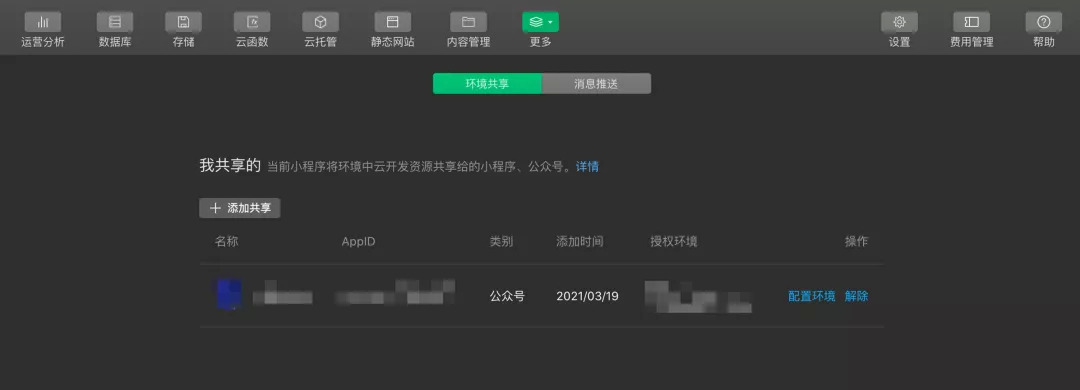 现在,开通环境共享后的公众号,也可以直接登入云开发控制台,完成查阅共享详情、进行消息推送等一系列操作,更加方便!