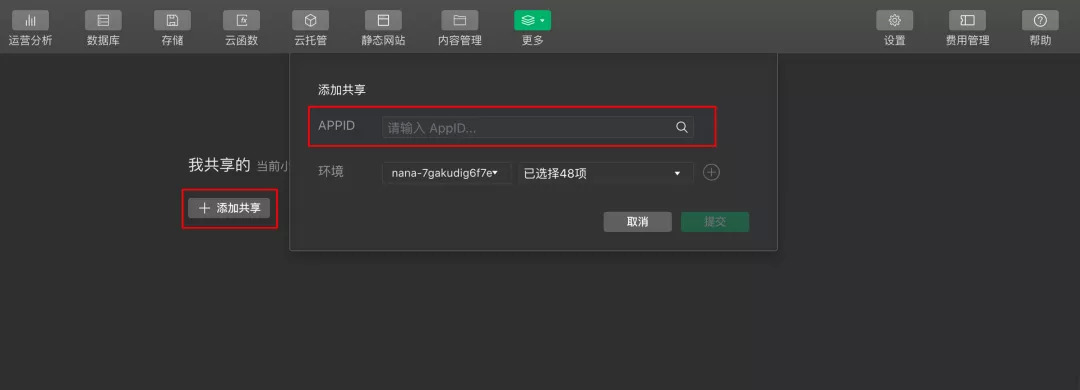 首先,按照要求将小程序的环境共享给公众号,操作步骤为:在 微信开发者工具-云开发控制台-更多-环境共享,将两者进行关联共享。