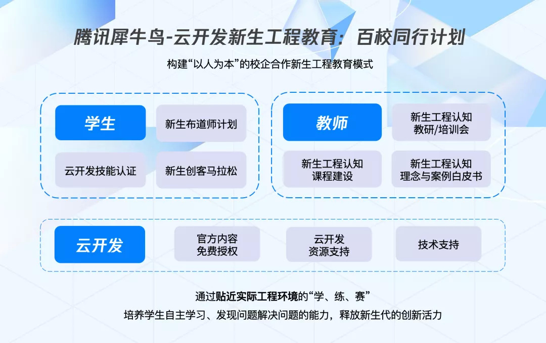 为增强新生的工程实践能力、培养面向未来的下一代开发者,腾讯云联合新工科联盟工程认知工委会、腾讯高校合作等联合启动**“新生工程教育百校同行”计划**(简称:百校同行计划)。基于“百校同行”计划,腾讯云将以云开发 CloudBase 为切入点,提供线上学习课程、新生工程认知师资培训、新生校园布道师计划、新生创客马拉松、技术认证、云资源等系列内容。通过贴近实际工程环境的“学、练、赛、考”模式,培养学生自主学习、发现问题和动手解决问题的能力,释放新生代的创新活力。