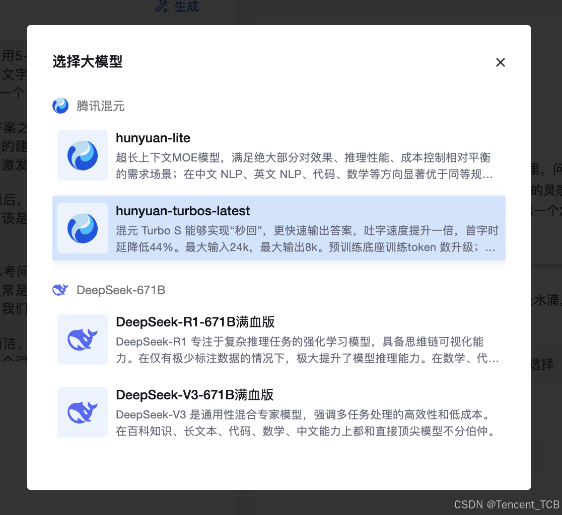 新增「混元 Turbo S」快思考模型,实现秒级响应(吐字速度提升 100%、首字时延降低 44%),与既有的 DeepSeek-R1 等慢思考模型形成能力互补。