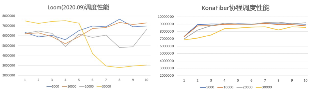 相对于OpenJDK社区的协程方案Loom,KonaFiber提供了更高更稳定的调度性能。图 3对比了KonaFiber和Loom在不同协程数量情况下的每秒调度次数。