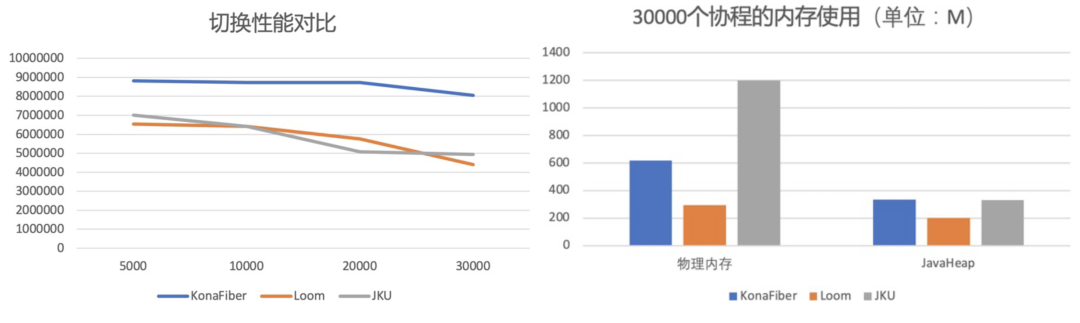 为了满足业务的需求,提供更好的协程切换性能,KonaFiber采用了基于JKU的StackFul有栈方案,为每一个协程创建独立的堆栈。当进行协程切换的时候,JDK在对于协程Pin状态检测以及上下文保存之外,只需要修改Frame Pointer和Stack Pointer的值就可以完成协程的切换工作,逻辑简单且性能开销很小。不过相对于社区的方案,KonaFiber的StackFul方案对于内存的使用要多一些,更适用于对于内存消耗不太敏感,但是对于性能更敏感的业务场景。性能数据如图 2所示,左图表示在不同协程数量情况下,每秒内协程切换次数对比;右图对内存消耗进行了对比。