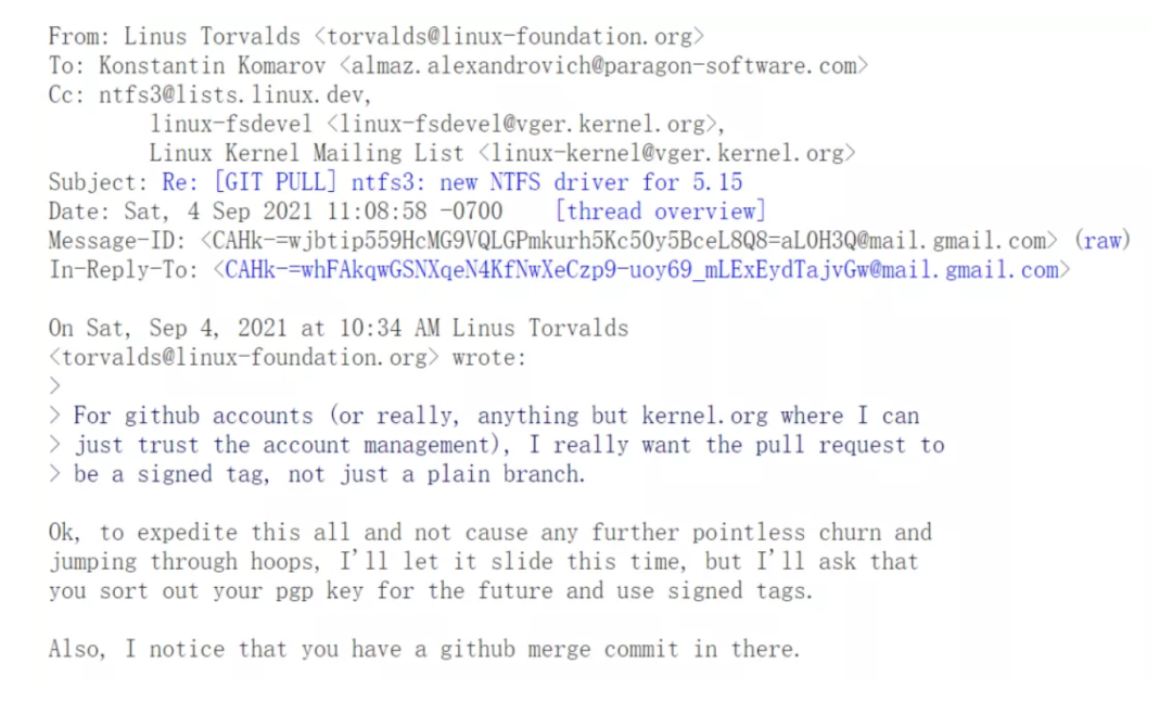 但是,Linux 的负责人 Linus Torvalds 对此申请非常不满,他的成见并不是针对于软件包的拉动请求,而是对于其中的 GitHub 合并提交: