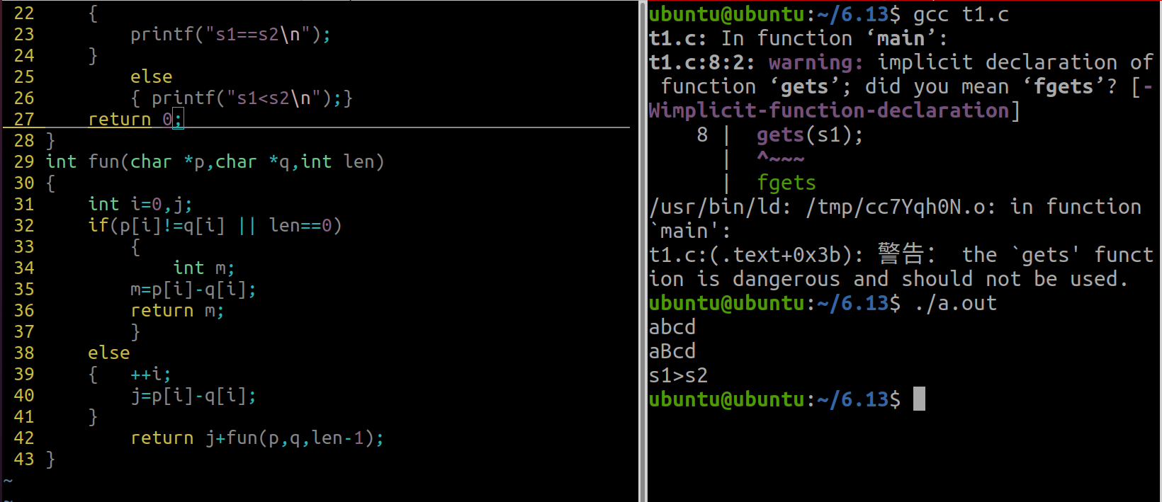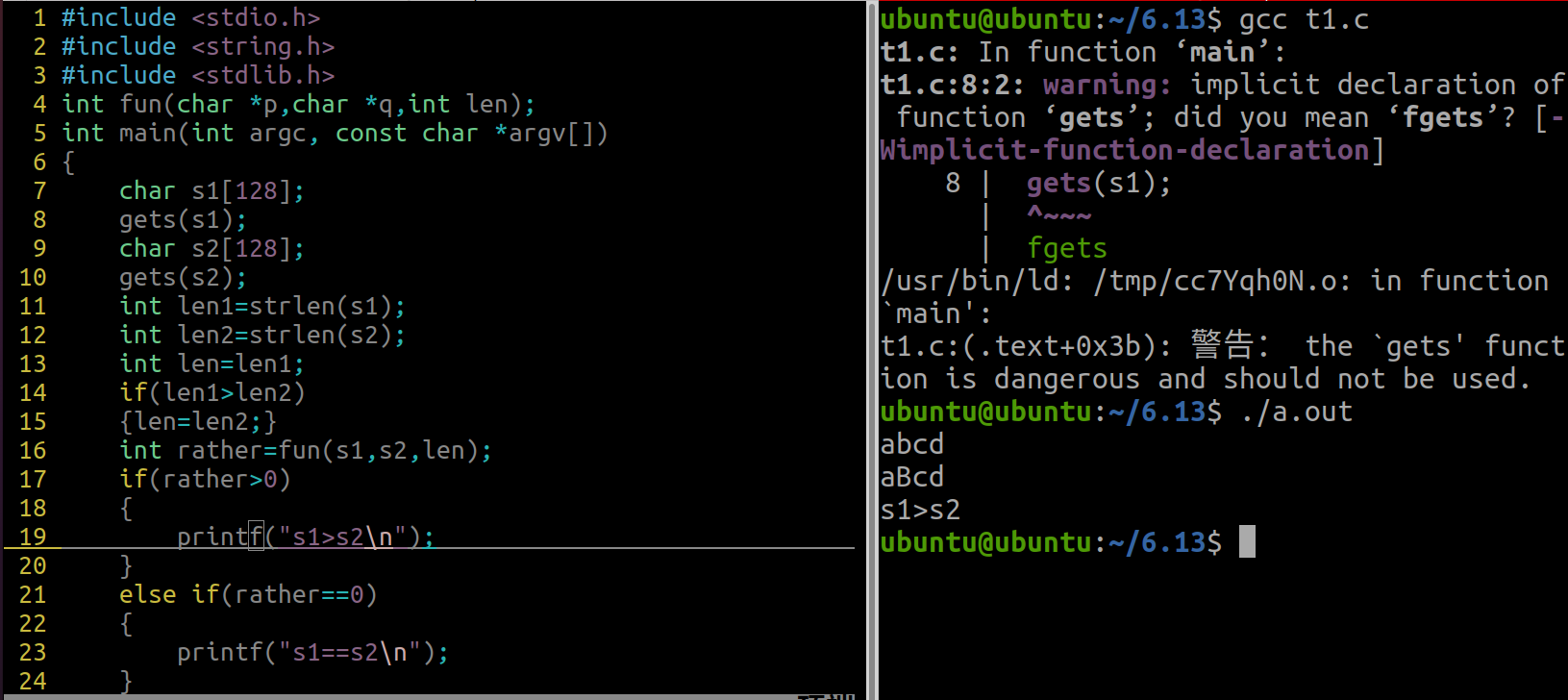 五、在主函数中定义两个字符串,实现字符串的比较,返回差值