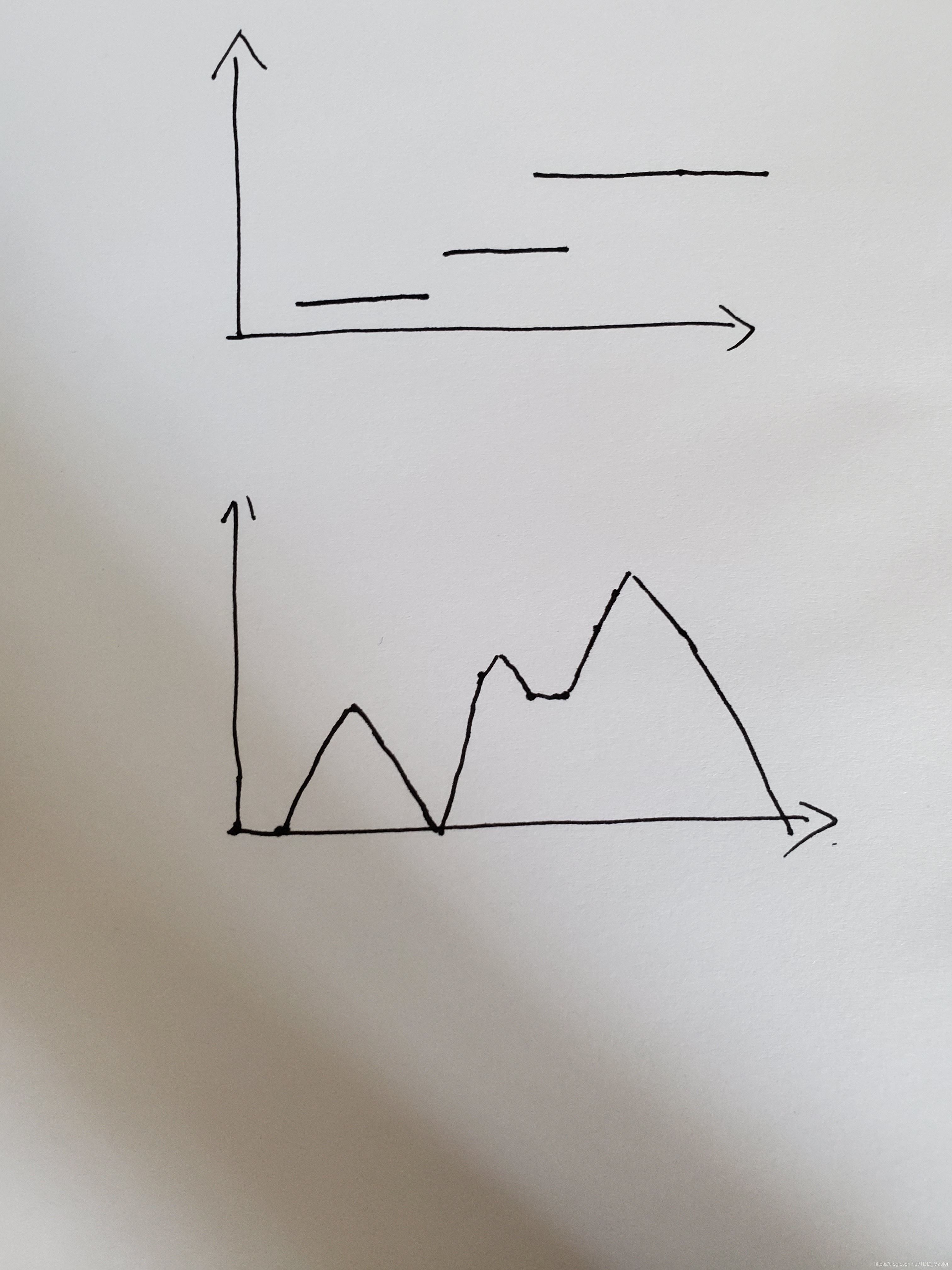 解:有0.5的存在,将L,R全都拉长两倍先。全部看成横条,放在xy轴上看好了,用函数y=kx+b来表示当对称轴为x时,面积为x。考虑只有一根横线的时候,那他的函数图像就是一个山形的,最大值在中间,而且斜率为1的-1,因为当达到中间的时候面积就是黑条的实际长度,即现在黑条长的一半,好理解。而有很多黑条那就时多个一次函数的叠加。而且可能的极值就可能出现在每个黑条的左端点,中间和右端点。函数叠加如下图: