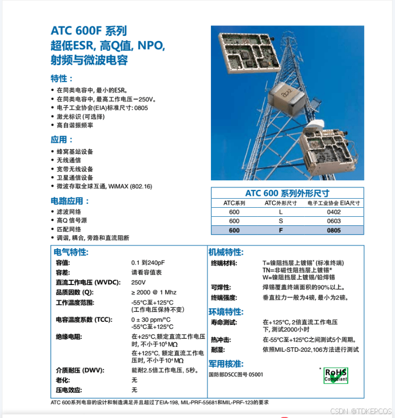 ATC射频电容的规格书提供了关于其性能、尺寸和应用范围等详细信息。