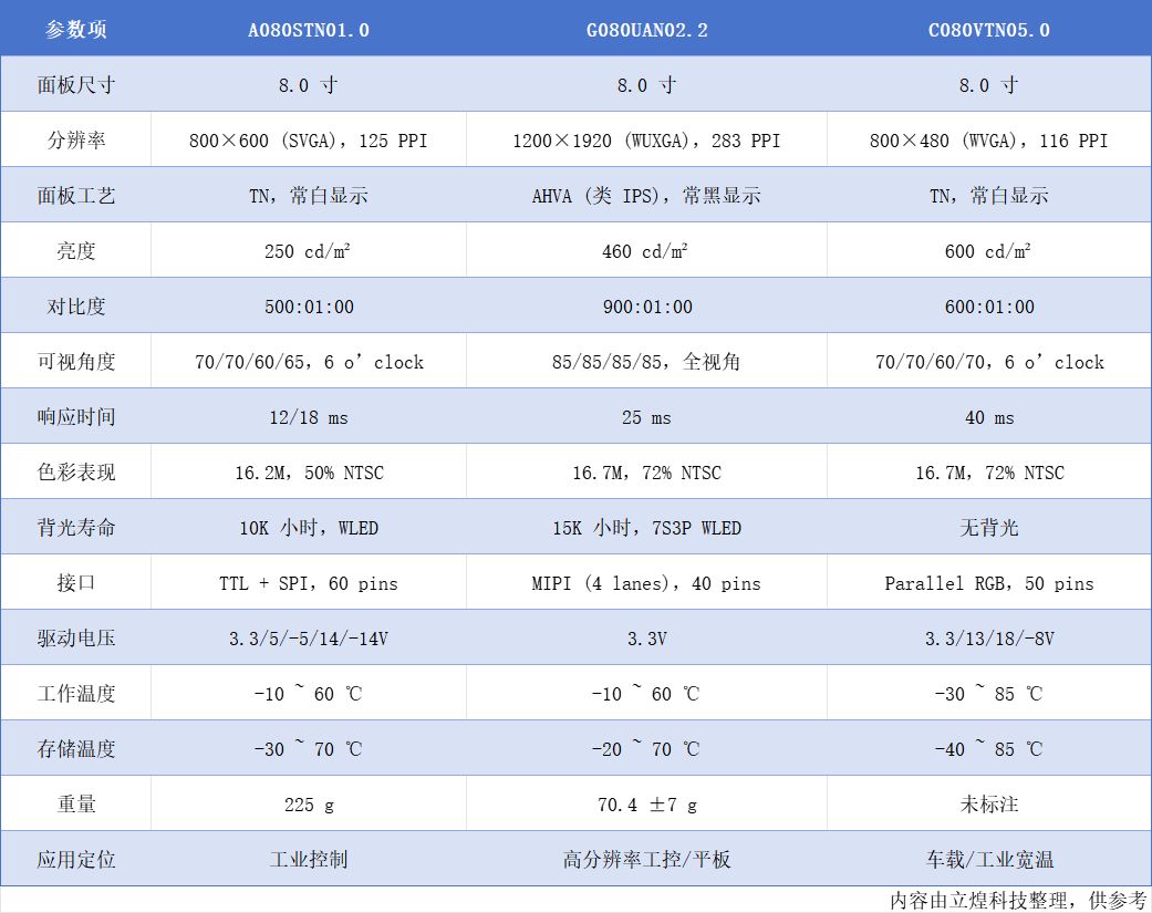 C080VTN05.0亮度最高(600cd/m²),适合户外和强光车载。