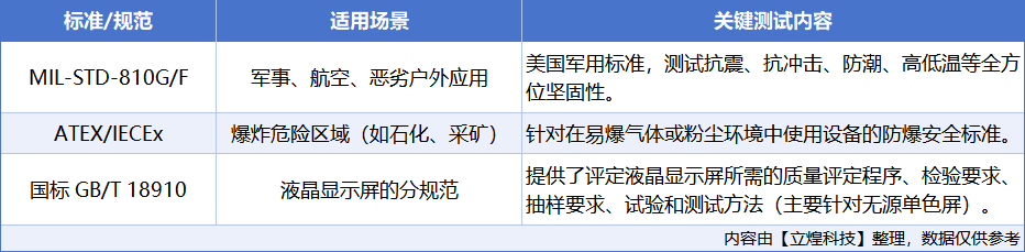 某些高风险或关键行业要求显示屏通过特定的可靠性测试或标准认证: