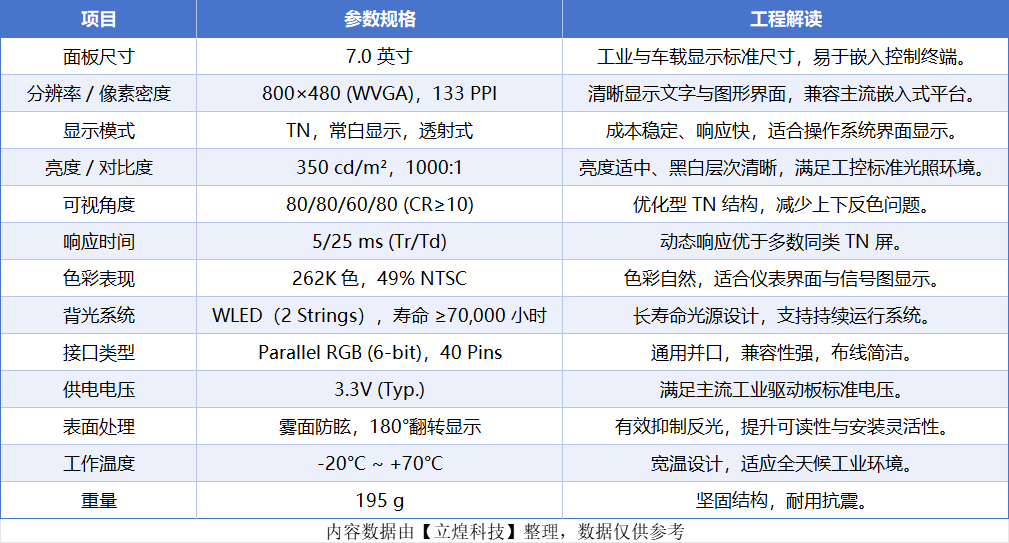 | TCG070WVLPAANN-AN00 | 800×480 | 350 cd/m² | 1000:01:00 | 70K小时 | -20~70°C | Parallel RGB | TN |