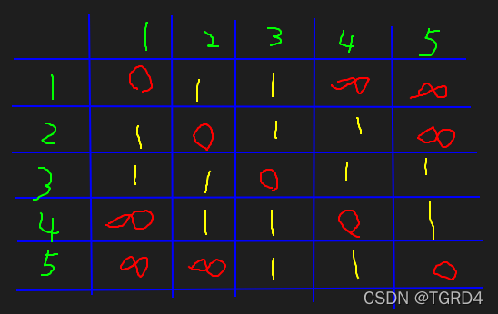 同样使用邻接矩阵表示(注意是双向到达),这里可以相通的两个城市间的距离都用1表示: