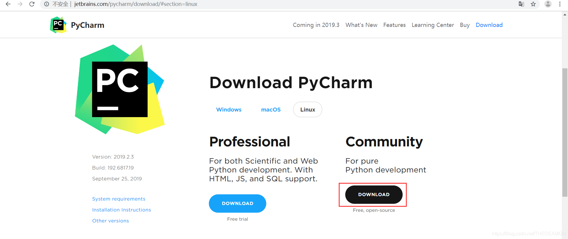 1.下载pycharm的安装包,进入pycharm的下载官网,选择linux的community版本,直接点击download下载。
