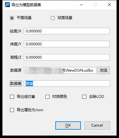 ①如果你的模型是根据实际的投影坐标系建模的,那么就选择平面坐标导出(有偏移值的再x,y,z处填写上偏移值,没有的就填写0,0,0)②如果模型没有根据实际的坐标值建模,常见的就是在0,0,0出建模的,那么场景投影信息可以根据实际项目需要填写