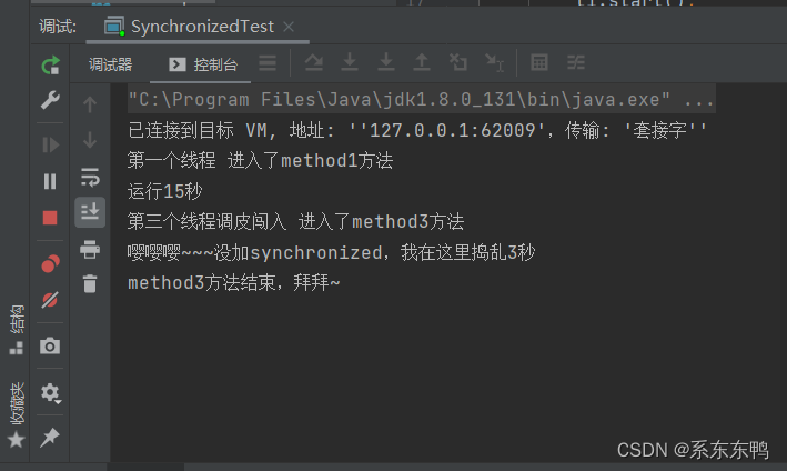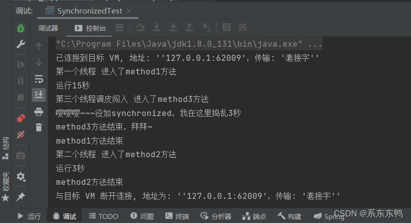 可以在方法中用Synchronized关键字给method1添加同步对象SynchronizedTest.class,只有占用SynchronizedTest.class才可以执行到这里,在程序一开始我们使用线程执行了method1(),在休眠1s后执行method2()。在实际运行时,method1()的执行过程当中(15s线程)的第一秒(休眠的1s),就执行了method2(),具体如下图