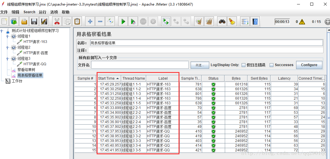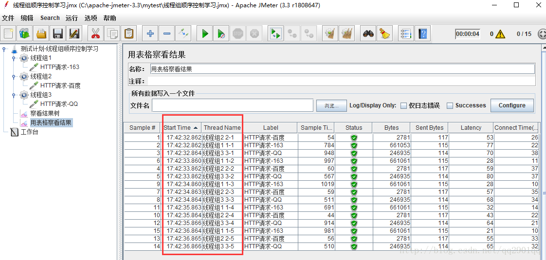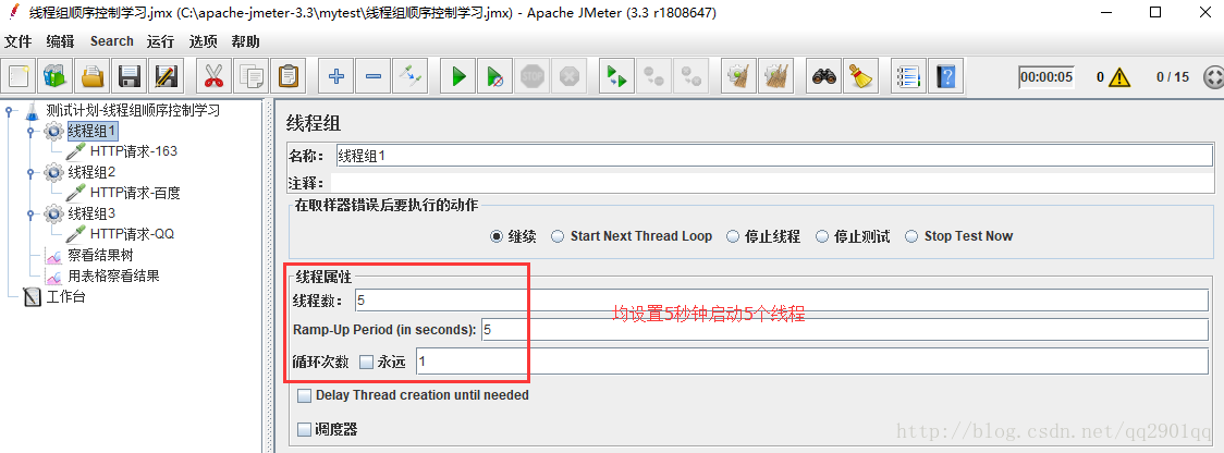 一、默认未勾选测试计划中独立运行每个线程组时,线程组并行执行,如下,设置三个请求,每个线程组设置5秒启动5个线程。