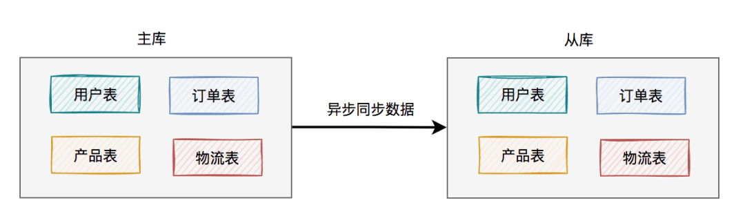 此时,使用的数据库方案是:一个数据库包含多张业务表。用户读数据请求和写数据请求,都是操作的同一个数据库。