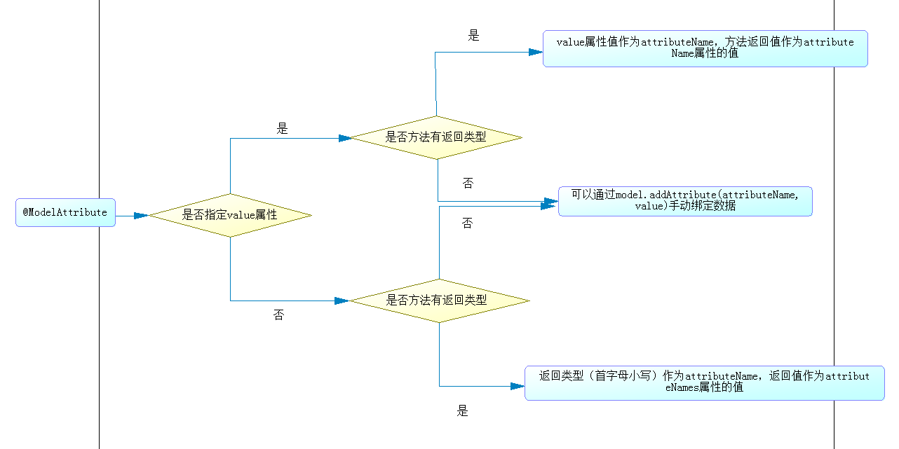 (2).一般来说,@ModelAttribute指定value属性后,value的值作为model的attributeName,对应的方法返回值作为attributeName属性的值;若未指定value属性,且有返回类型,则取返回类(首字母小写)作为attributeName,返回值作为attributeName属性的值。大概的流程如下图: