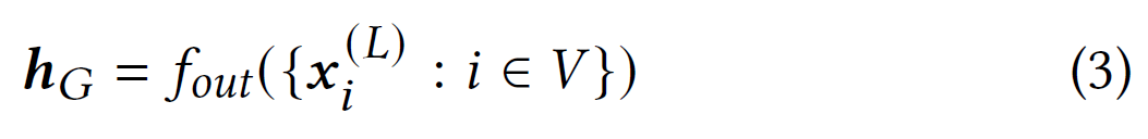 令 L L L为 GNN 中的层数。 在 L L L层的 L L L步消息传递之后,最终的节点表示捕获了有关图结构和 L L L跳邻域内节点特征的信息。 对于图分类任务,读出函数 f o u t f_{out} fout用于通过聚合最后一层中所有节点的表示来生成图级别表示 h G h_{G} hG: