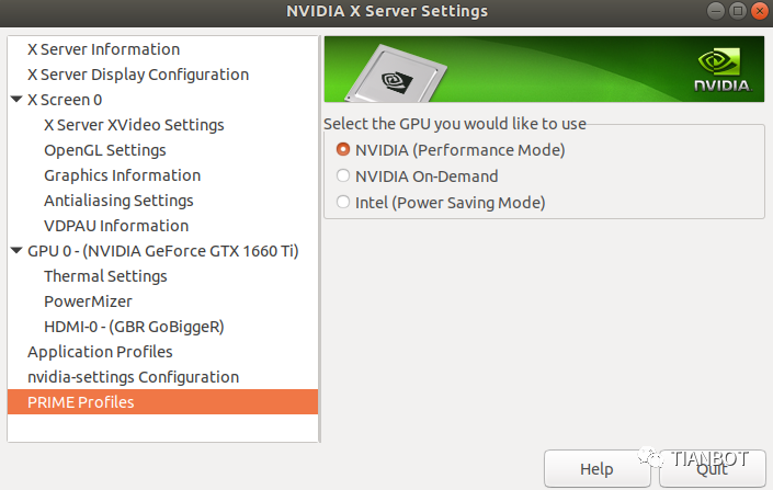 点击窗口左侧列表的最后一项“PRIME Profiles”,然后在右侧选择NVIDIA性能模式,输入管理员密码确认修改,重启电脑。