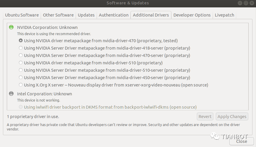 打开软件与更新/附加驱动栏,此时能够看到新下载的显卡驱动,我的显卡是1660ti,选择第一项nvidia-driver-470: