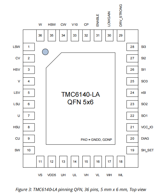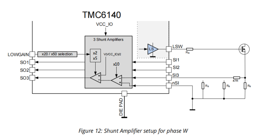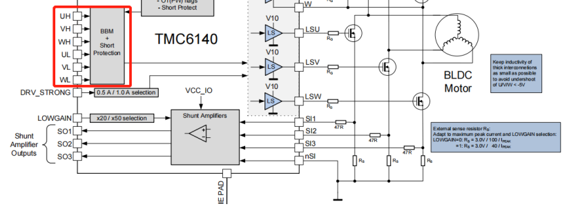 TMC6140芯片是QFN36(5*6 :mm)封装,带有散热焊盘,TMC6140还集成了三相电机线圈的低端电流感应放大器(TMC6200支持三路在线电流感应放大器)一般采集方式是在低侧桥臂串联采样电阻,通过放大器对电阻的电压采集,来监控电机电流。这个集成放大器也使得TMC6140更具性价比,可以通过放大器可以对系统进行过流保护、外部扭矩控制或通过外部控制器进行换向等。运放增益可以通过寄存器配置或者硬件引脚LOWGAIN选择20和50两档。