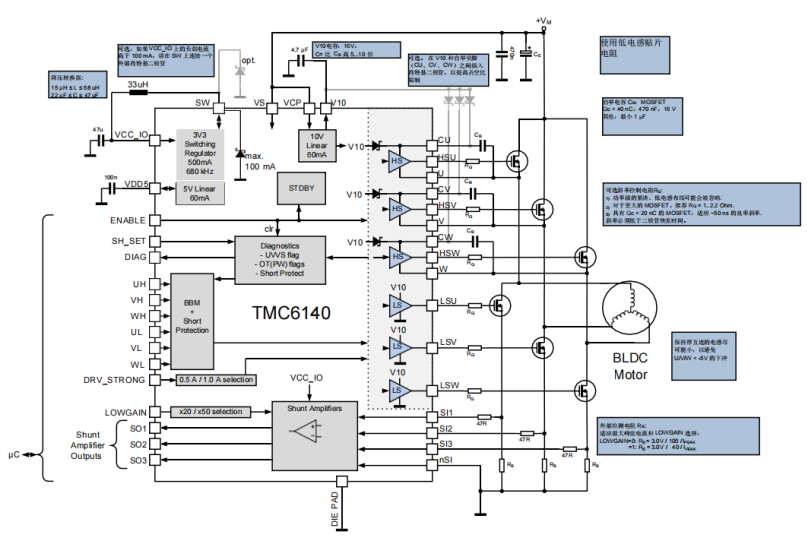今天和大家分享一颗智能栅极驱动芯片完全集成的通用三相MOSFET 栅极驱动器,适用于 PMSM 伺服或 BLDC 电机. 支持高达 100 A 电机电流的外部MOSFET. 三个底部分流放大器可以轻松检测电流并增强电机的换向。TMC6140设计为单一电源轨,自带开关稳压器(3.3 V,0.5A,内部肖特基二极管,电流高达 100 mA)为 IO 和外部微控制器产生足够的电力. 此外,它可以用作升压转换器以静态稳定 MOSFET 的栅极电压。 提供UART通讯用于进一步诊断的 DIAG 输出和两种不同的电源下降模式可用。结合了多种控制方式和保护模式,可以有效提高整个控制系统的稳定性和可靠性,下面我们就来分享一下这颗芯片。