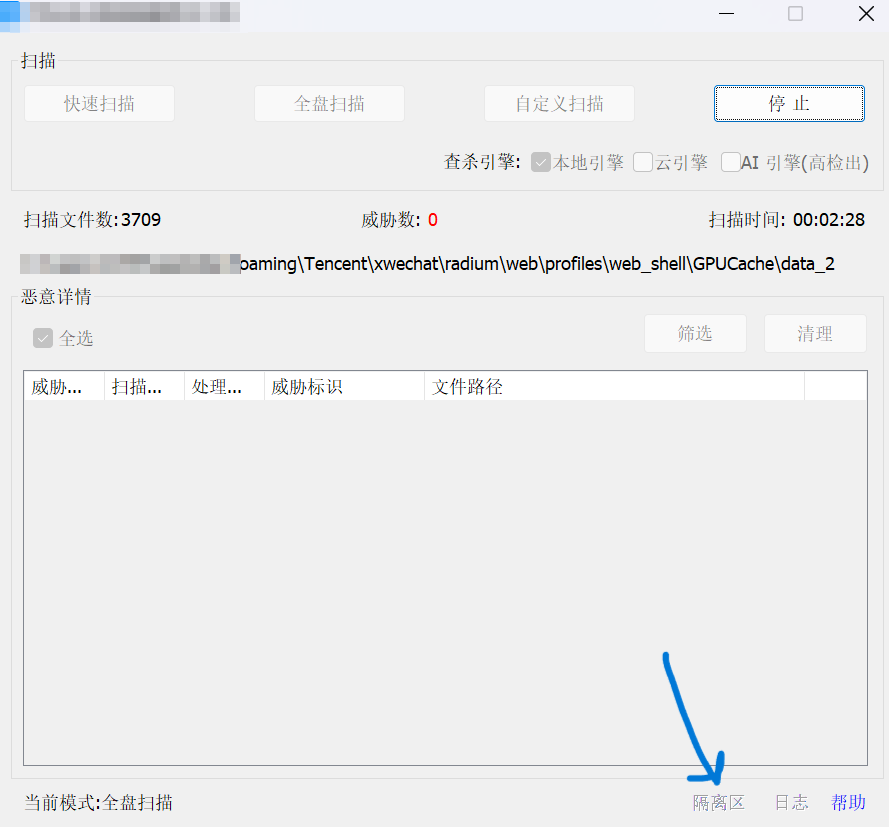 同时对于有意保留的文件,和敏感文件,可以设置隔离区来排除检测