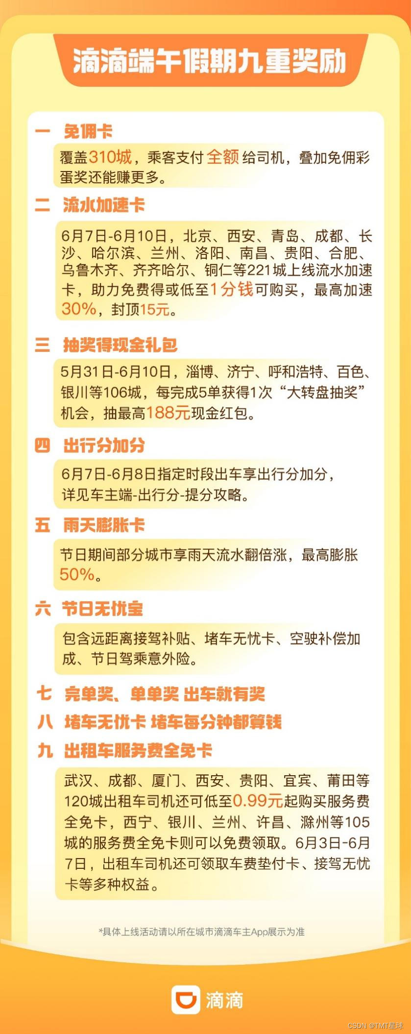 滴滴出行预测,端午节当天(6月10日)打车需求将同比去年上涨约31%。今年端午,滴滴将发放超2亿司机补贴,上线九重奖励助力司机单多收入好,覆盖全国300多个城市,包含免佣卡、流水加速卡、出租车服务费全免卡、抽奖得现金红包等多重活动,致谢司机假期坚守,保障多场景出行需求。