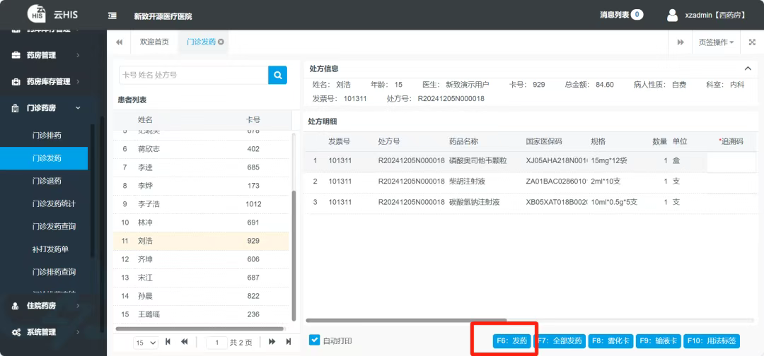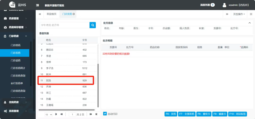 2.选择患者,双击左侧待发药患者进行发药。