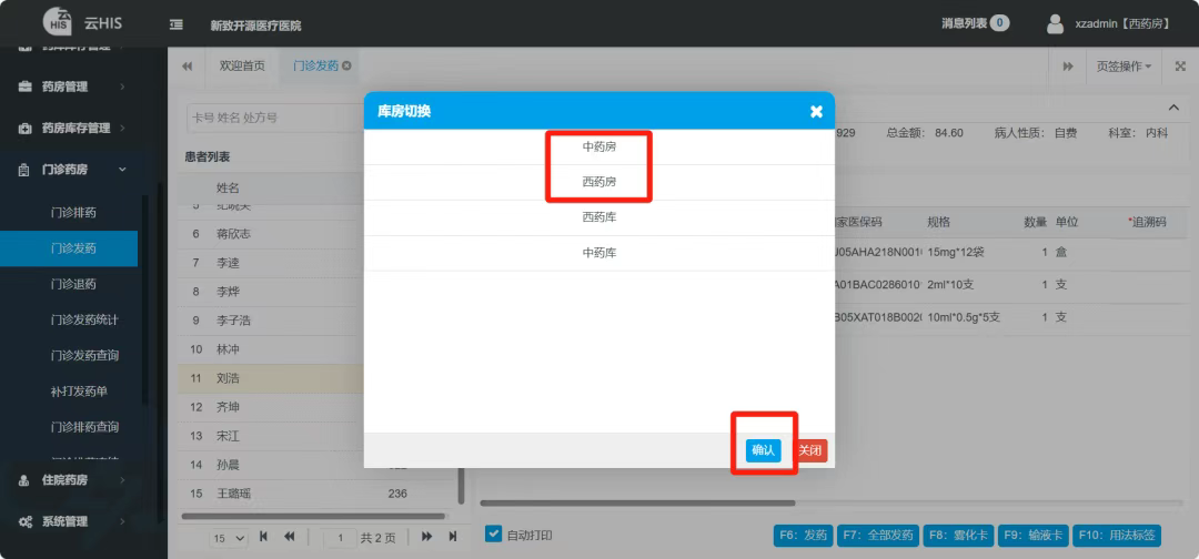 注:发药要注意切换药房。患者处方中若含有西药,需要选择西药房,若含有中药,切换为中药房。