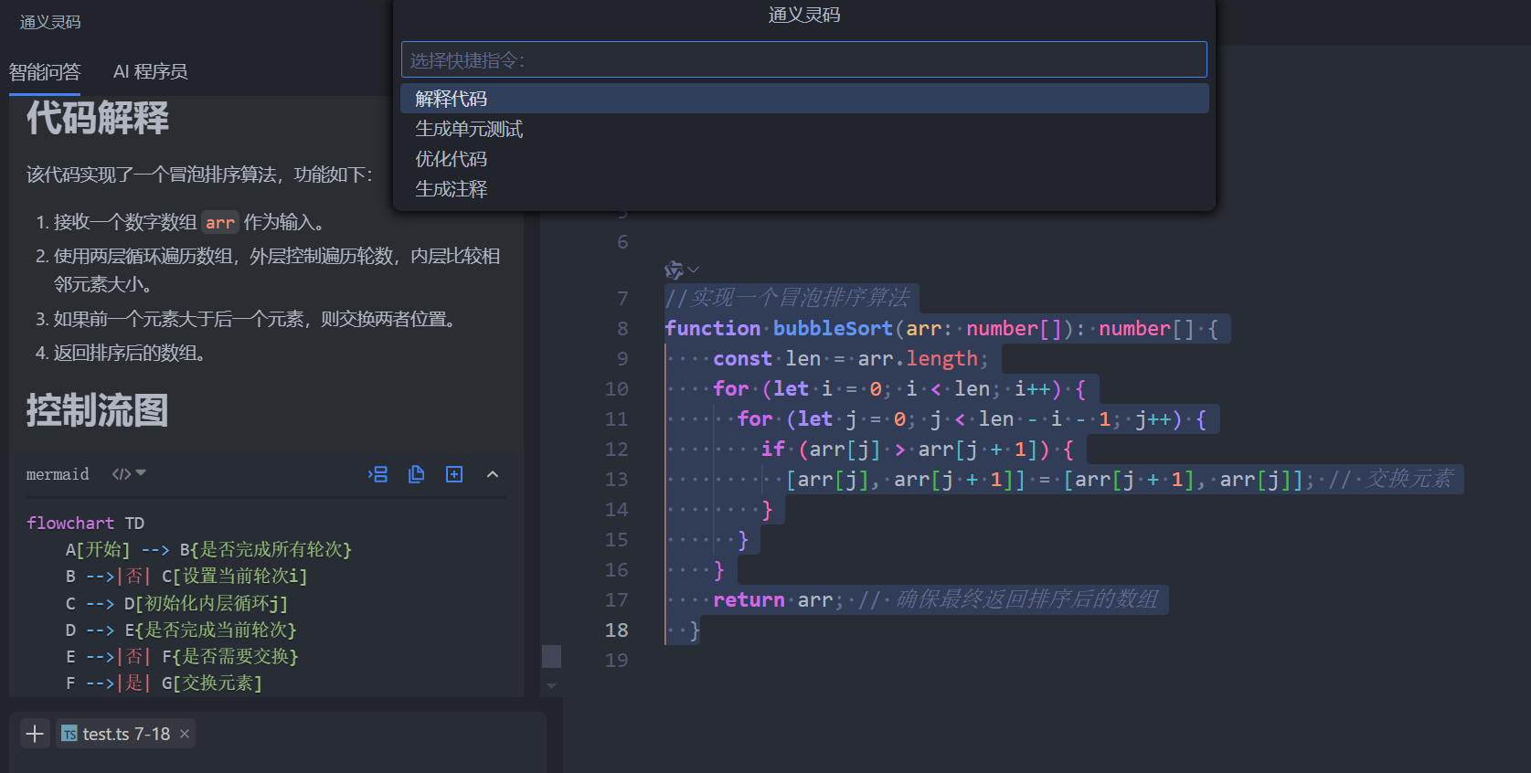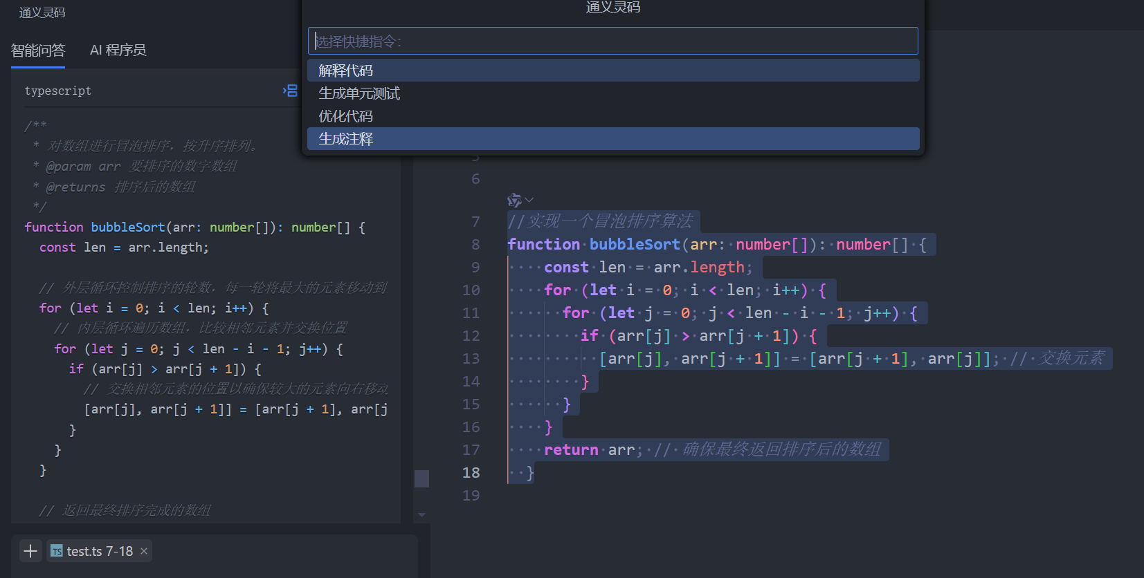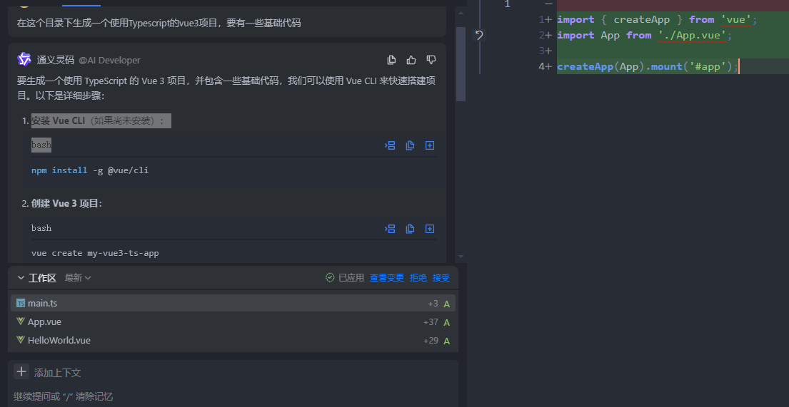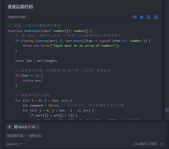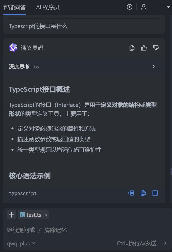 例如,你可以向它咨询 TypeScript 中某个语法的用法,或者请求它生成一个特定功能的代码片段。