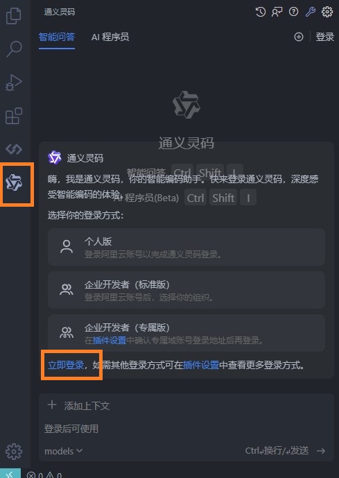 安装完成后,VSCode 的左侧会多出一个通义灵码的图标,点击即可进入插件界面。