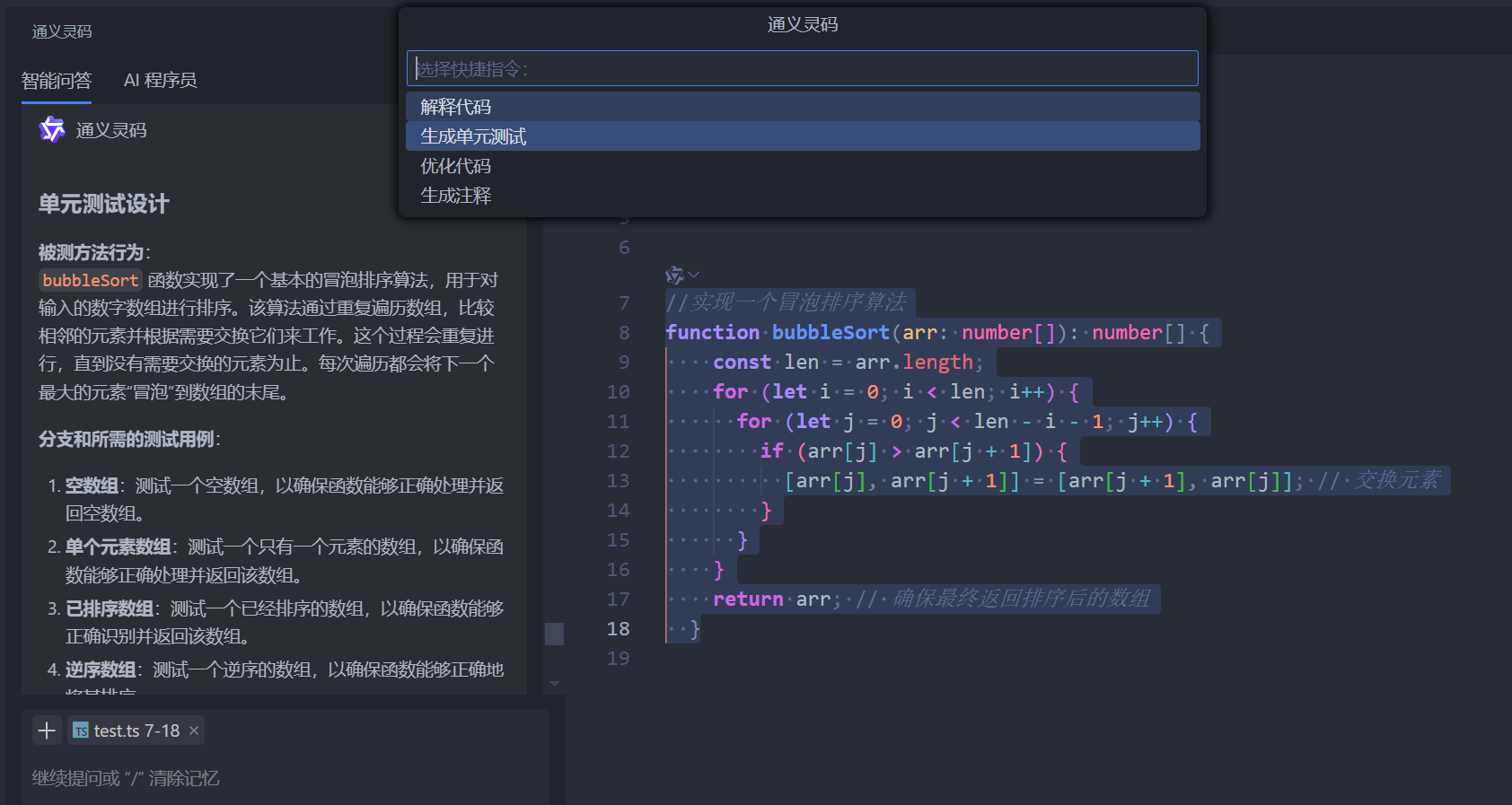 通义灵码甚至还能贴心地生成对应的测试代码: