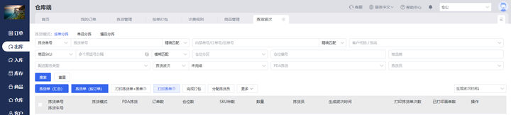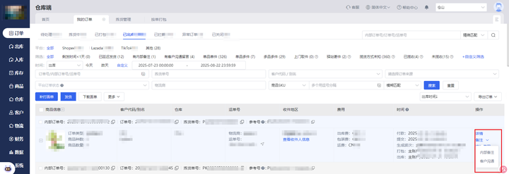 在出库环节,支持多渠道订单接入,包括TikTok Shop日区、妙手ERP等推送的订单,实时精准获取订单信息,自动拉取订单,还支持对订单进行智能化合并与调度,具备波次发货功能。