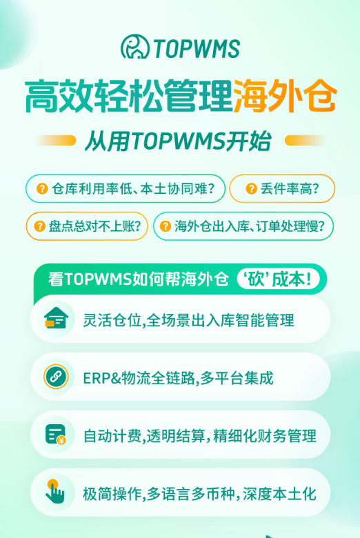 以上就是为什么海外仓要使用海外仓管理系统的原因和海外仓系统功能的示例,选择适配自身业务场景的海外仓WMS(如 TOPWMS),能为跨境仓储运营提供稳定技术支撑,助力企业在海外市场更高效地服务客户、提升竞争力。