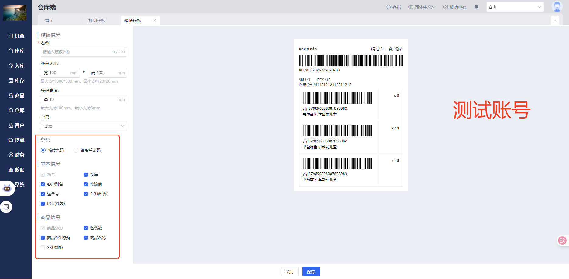 货物的包装应该有统一且唯一的箱唛,即箱条码,TOPWMS支持在系统中设置仓库独有的箱唛模板,可以包含仓库信息、客户别名、商品信息(运单号、物流商、sku数等等),便于后期到仓后仓库人员的核对。