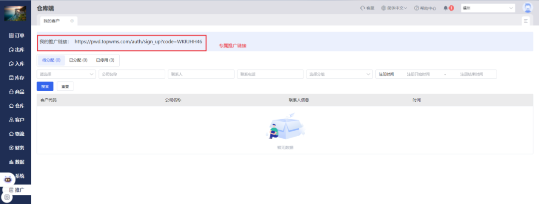 仓库方可为每个推广者创建账号并生成专属推广链接,客户通过该链接与仓库合作后,系统会自动关联推广者与客户,打破推广追踪效果模糊的困境,为后续佣金结算提供明确、可验证的依据,避免产生推广激励纠纷。