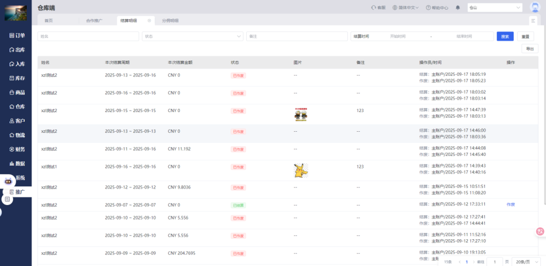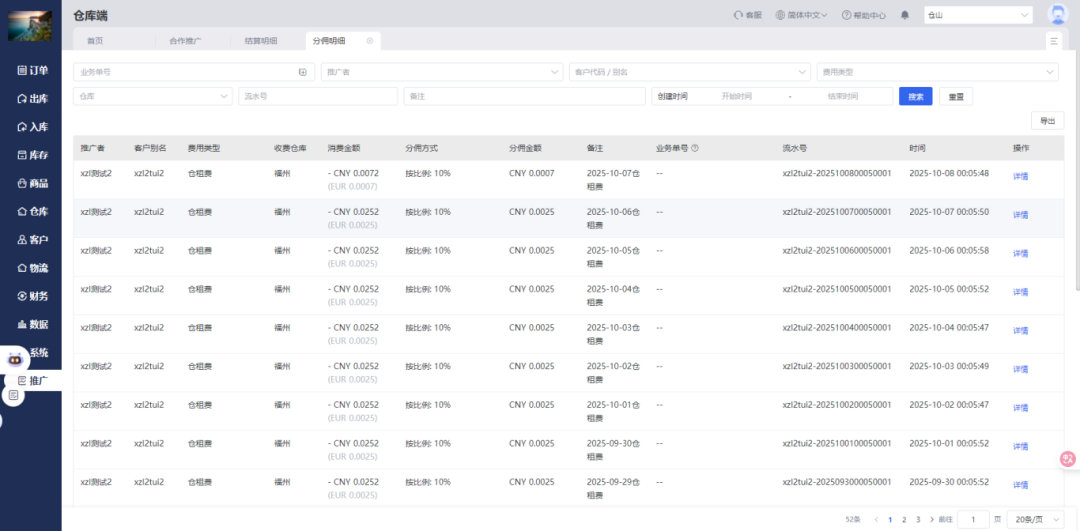 除了简化结算流程外,仓库方和推广者皆可登录系统查看佣金结算明细、分佣明细,结算明细页面可查看周期内结算佣金、结算时间等,分佣明细可定位每笔佣金的具体费用来源,且支持多维度筛选,仓库方与推广者可清晰核对每笔佣金的来源和计算逻辑,账单透明度高,避免佣金金额有争议的问题,可减少仓库方和推广者的对账纠纷。