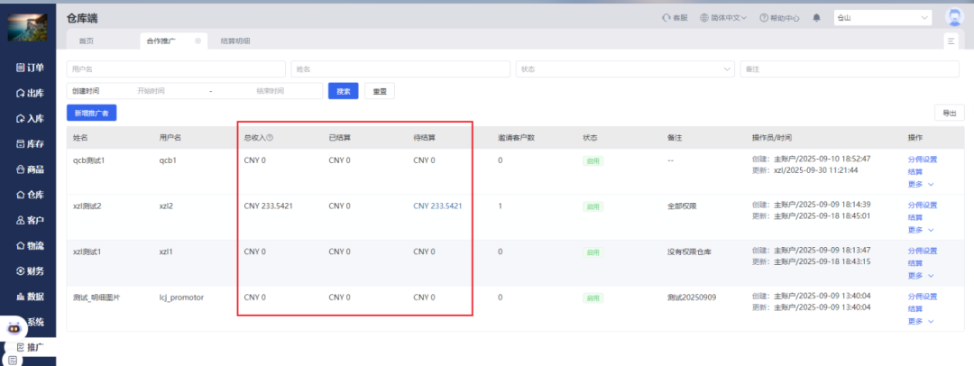 而且,仓库可直接查看推广已结算和待结算金额,并导出推广者列表,无需手动整理台账,快速掌握所有推广者的佣金结算状态,降低运营管理成本。