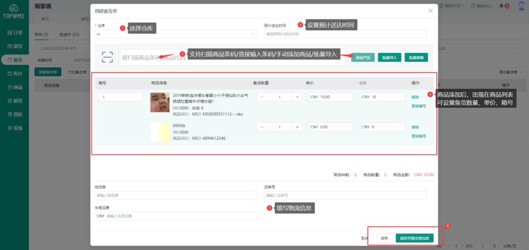 海外仓的客户可直接通过TOPWMS的OMS(商家端)批量添加商品,快速创建备货单,一键推送,简化备货流程,规避因客户操作不规范引发的失误,进而降低入库作业的复杂度与难度。