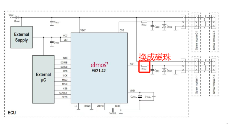 根据以往经验,拔除某一根线束后,频点能够消失或者下降明显,大部分情况下源头都是来自该链路信号,而非仅仅是作为辐射源的载体。因而,我们可以根据功能推断可能是来自哪个模块,根据以往经验,尚未遇到CAN,LIN,MIC,喇叭功放的模块出现类似问题,所以优先选择了雷达信号,雷达芯片的信号包括,DSI,VBAT和GND。