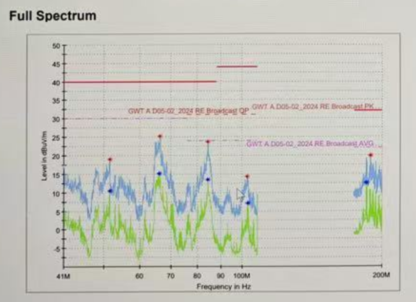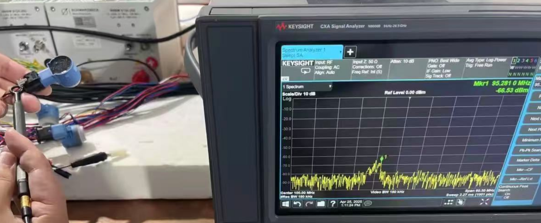 根据扫描的结果,我们可以基本判定干扰源来自主机,正好此时跟软件同事确认,将雷达断电后,DSI信号仍然正常发送,于是我们将雷达断电,复测结果,发现超标频段仍然存在。