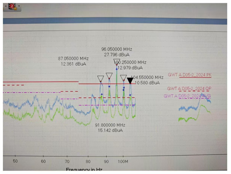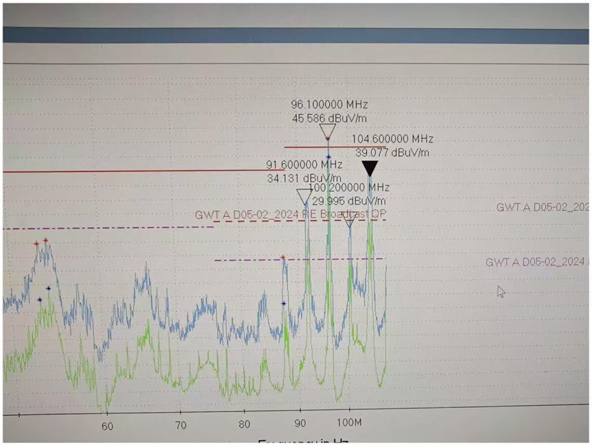 我们从FM到以太网连接器线束逐个拔除(注意,拔线束时建议做加法,即拔完一根线束,再拔另外一根线束时,之前的线束也是处于拔除的状态,因为这个超标频点有可能是多根累加的结果,单一拔除某根可能始终无法满足测试要求),发现超标频点虽然有所改善,但是超标频点仍然存在。
