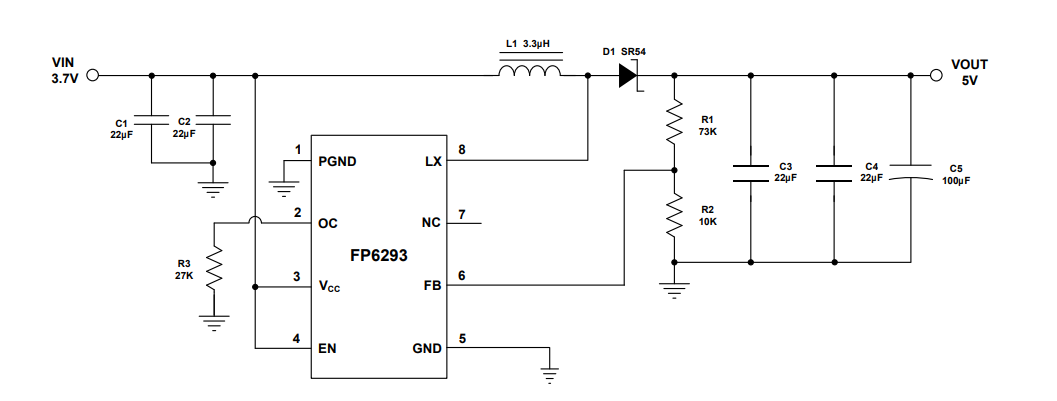 原理图上参考芯片原厂的设计,但从EMC角度上输入和输出滤波电容太少,针对不同的超标频段应该多放置几个量级电容,每个量级间隔100倍,提供更宽频段的滤波效果。以下是芯片原厂设计: