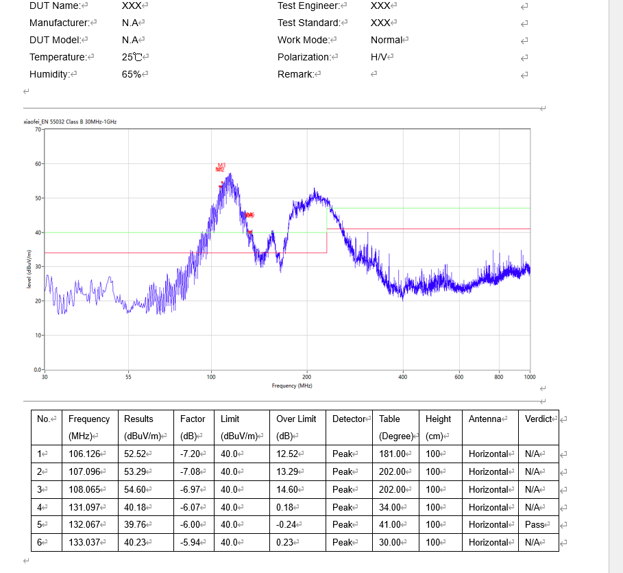 2.限值数值:例如,30MHz至230MHz的频段,限值为30dBμV/m(以10米距离测量),230MHz至1GHz的频段,限值为37dBμV/m。