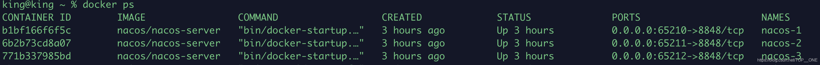 3、上面三步将三个nacos服务都启动了,结果如下,通过访问localhost:65212/nacos、localhost:652111/nacos、localhost:65210/nacos来测试是否成功启动平台