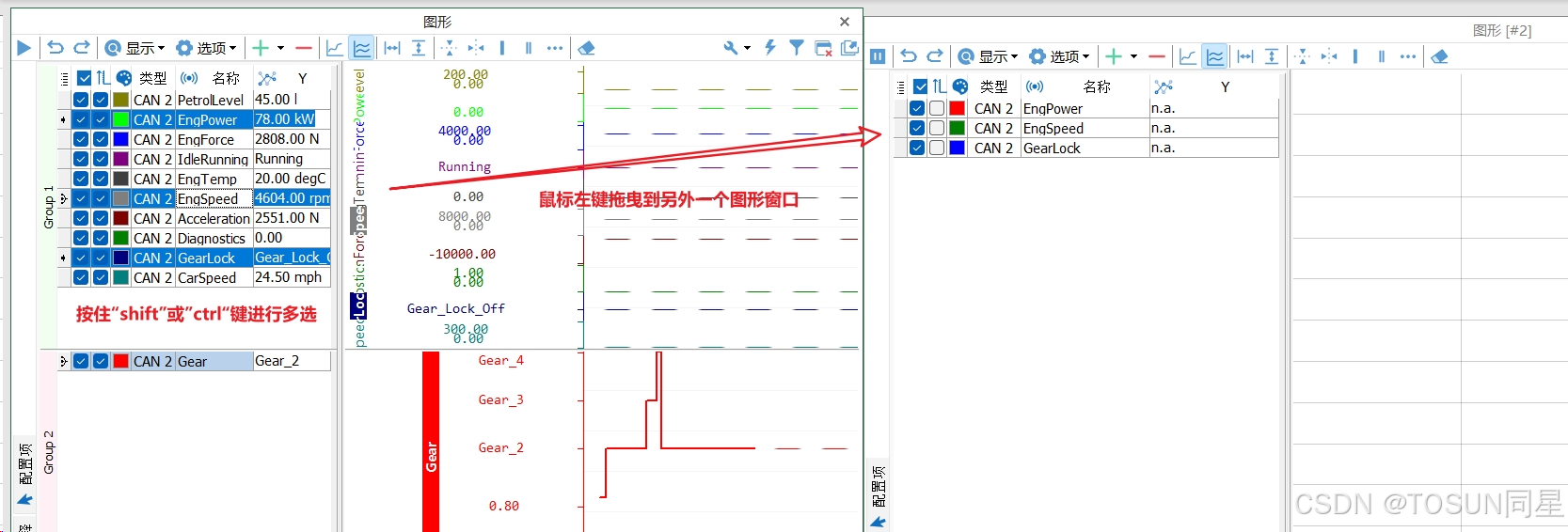 A:可以通过“shift”或者“ctrl”选择多个信号,并保持按住“shift”或者“ctrl”键,用鼠标左键拖曳到另外一个图形窗口。